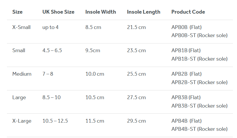 The A.P.B.® (All Purpose Hi Boot) is a closed toe boot used for the treatment of the diabetic and insensitive foot or as a post-operative boot and is available in black in either a flat or rocker sole version. Both versions are bi-lateral but have slightly different closure techniques.