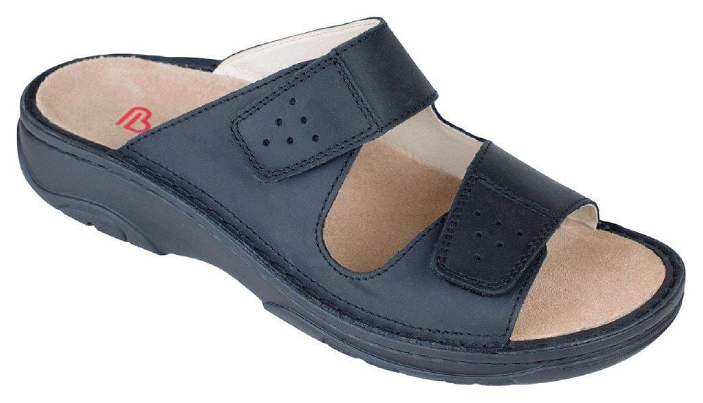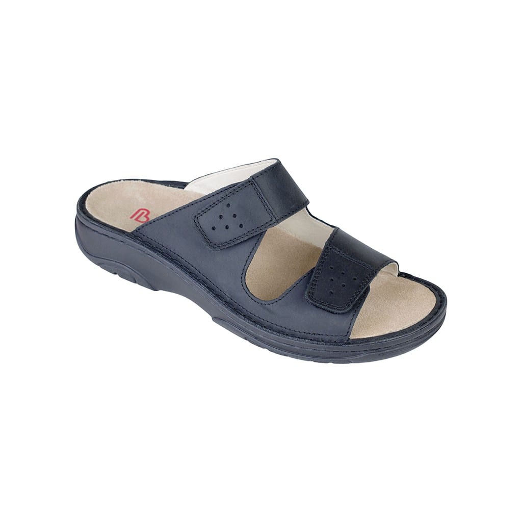 Hand seam and removable foot bed - with the comfortable men's slipper Luis Berkemann introduces a model in the range in which men's feet just feel comfortable. The elaborate hand seam gives the shoe extra flexibility, while the washable, leather-covered removable foot bed with its original 5-phase foot bed supports the natural rolling process of the foot and thus relieves the joints. The two straps, which can be fully opened and padded with genuine leather, ensure comfortable entry and exit, while the variably adjustable Velcro fasteners ensure child-friendly handling. Due to the replacement foot bed, Luis is also particularly suitable for the use of orthopedic custom inserts.