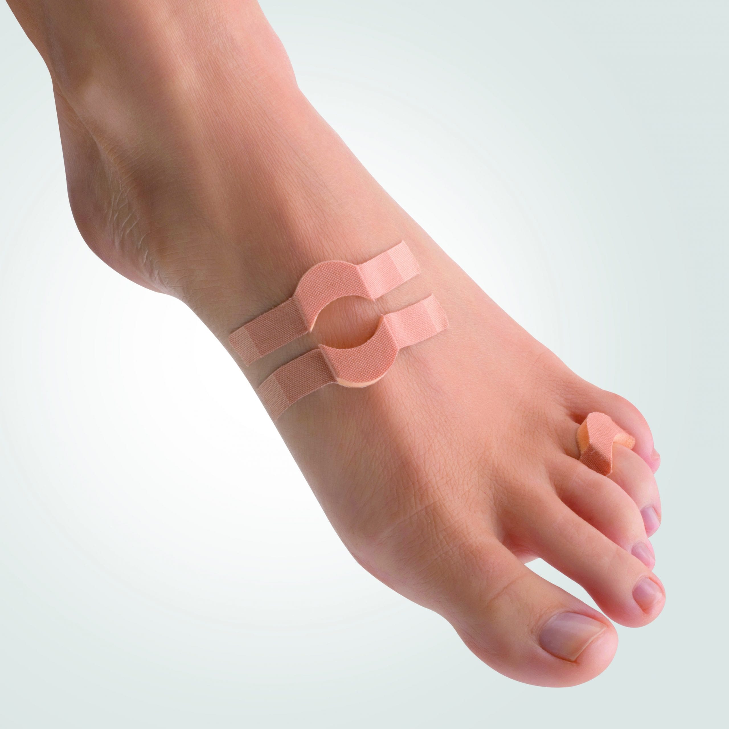 Pressure protection pads relieve pressure sores caused for example by corns, calluses and blisters. The pads are made of non-irritating foam and in pre-cut bow shape. They can be optimally placed next to the pressure sore with the self-adhesive wings on their sides.