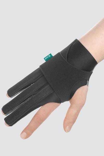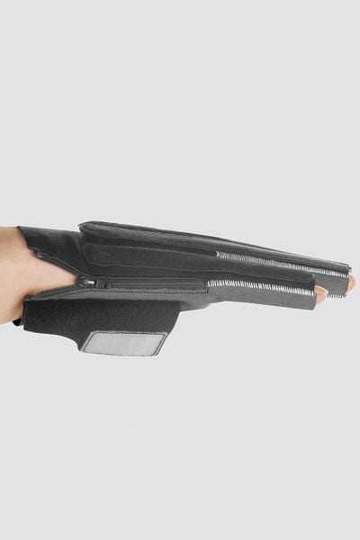The JuzoPro Digitus orthotic glove is used for the fixed extension of the middle, ring and little finger to achieve an ideal operative outcome. The mobility of the thumb and index finger is not restricted. The removable and individually shapeable stabilisation rods also allow for fixation of individual fingers – unused finger pockets can be trimmed with a pair of scissors.