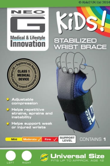 The Neo G Kids Stabilized Wrist Brace is a heat therapy device is specifically designed for the younger wearer and has features a removable metal splint to allow variable stabilization of the wrist and hand. The adjustable strap provides additional compression around the wrist and/or hand if needed which can help encourage correct alignment of the carpal bones and therefore help reduce inflammation in the wrist, which is useful in the management of juvenile carpal tunnel syndrome. The support can also be used to help reduce strain caused by repetitive movements at the wrist associated with typing, writing and other recreational or sporting activities. The durable, heat therapeutic neoprene helps with arthritic wrists, chronic aches and stiffness.