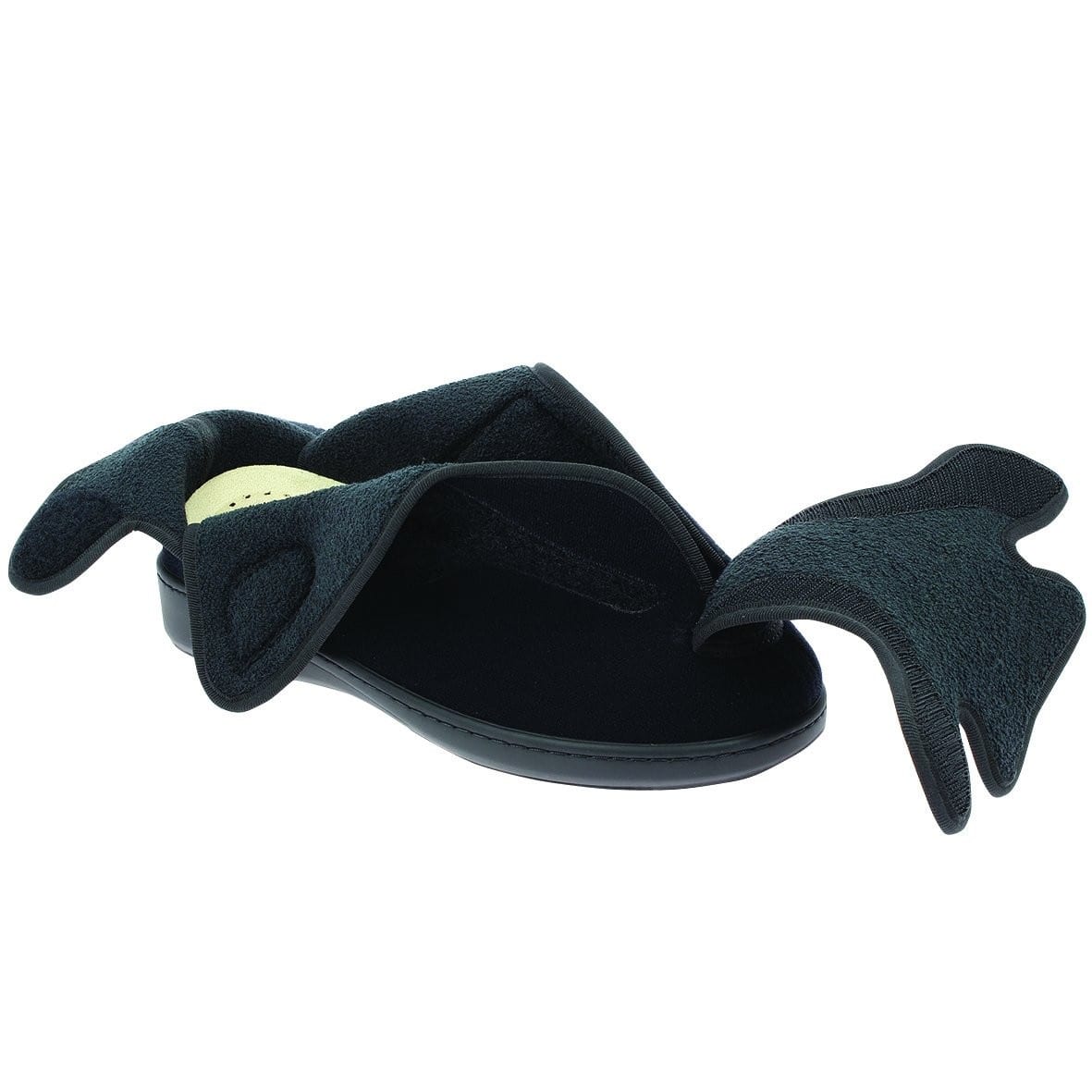 An extra roomy, washable, lightweight and flexible slipper with extra deep adjustable opening in the front and back for a stable and comfortable fit.