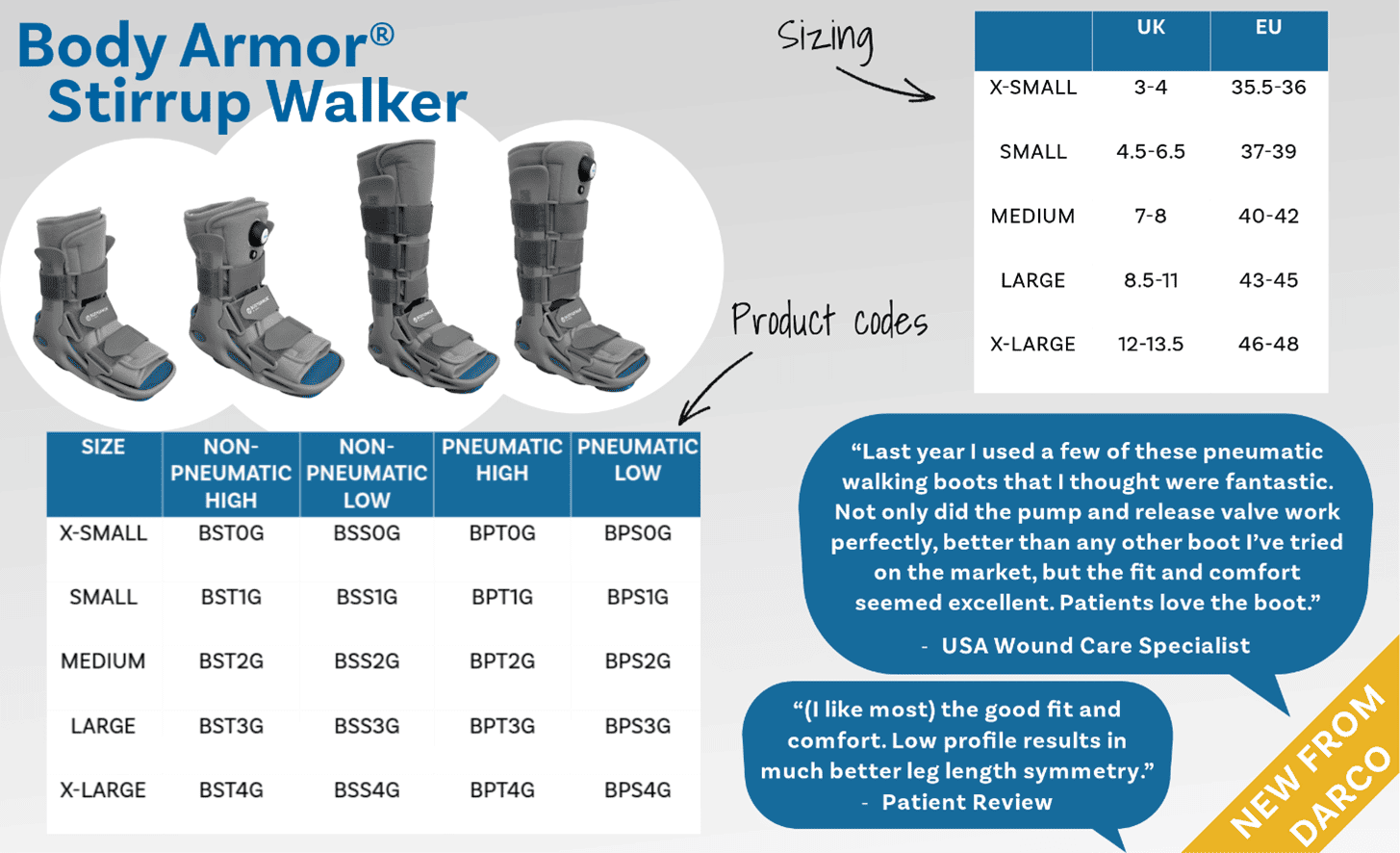 Featuring DARCO’s innovative PowerPods® outsole design, the Body Armor® Stirrup Walker delivers on comfort throughout the healing process. Made from a continuous layer of high-rebounding EVA foam, DARCO outsole holds its shape and thickness over time to deliver lasting comfort and protection you can rely on.