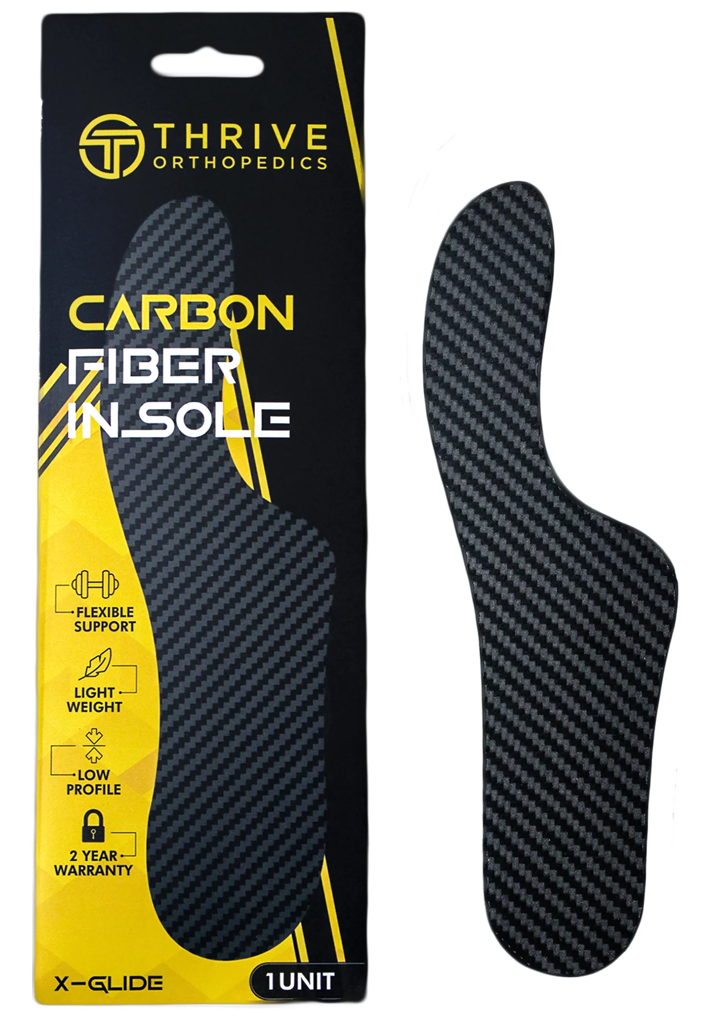 Thrive Orthopedics X-Glide Rigid Morton’s Extension Carbon Fiber Insole adds rigid support to any shoe. The rigid, Morton’s Extension turf toe footplate is designed to limit the range of motion and remove excess pressure from the big toe.